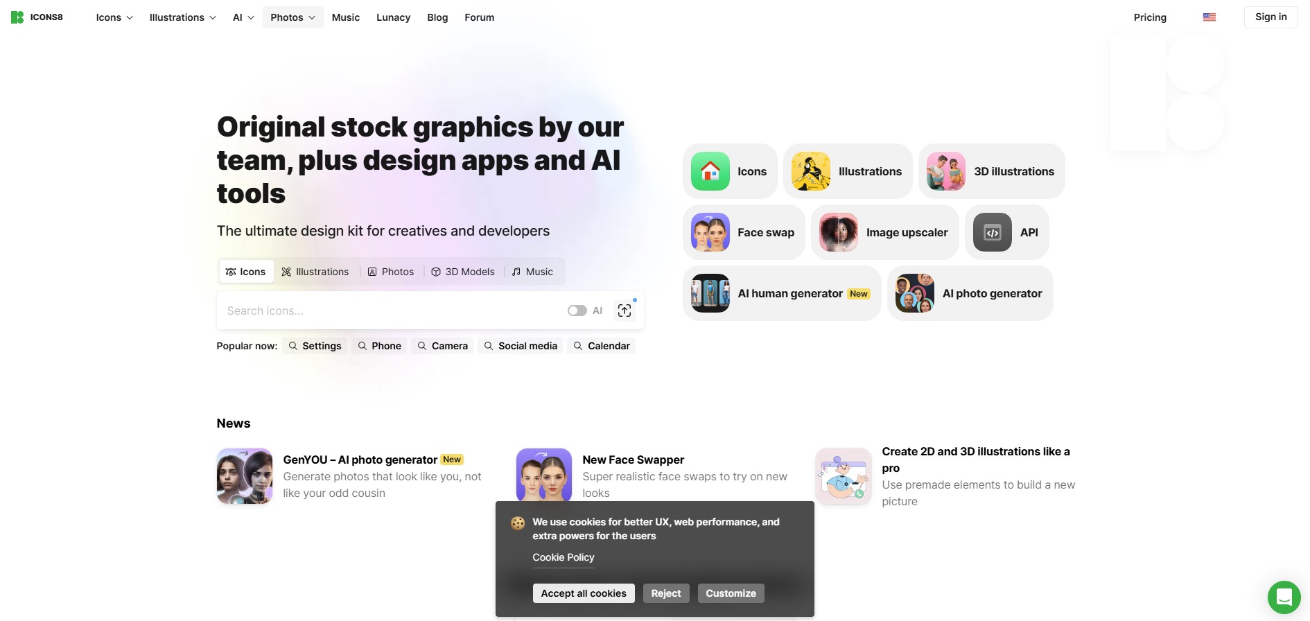 Features hundreds of thousands of icons in PNG and SVG formats, with built-in customization tools. You can adjust color, size and style before downloading and even use AI-powered tools like background remover.