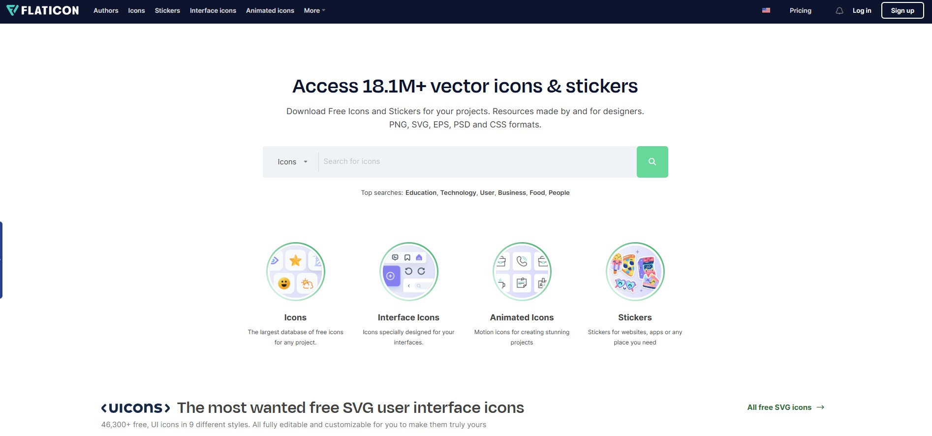 Boasts over 18.1 million icons and stickers in PNG, SVG, EPS and PSD formats. Users can easily search and download with customization options like size and color. Offers a free plan with attribution and a premium version for commercial use without credit.